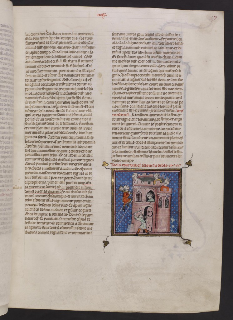 Le manuscrit le plus remarquable de cette période est assurément l’exemplaire de Clairvaux de l’Histoire scolastique en français. Ce texte, traduit à la fin du XIIIe siècle, est copié et enluminé de manière intensive à Paris dans les premières décennies du XIVe siècle. L’exemplaire claravallien ne présente pas moins de 141 enluminures historiées. Elles illustrent des passages de la Bible tel que la Création, le meurtre d’Abel par Caïn, le Déluge, Job sur son fumier, les exploits de Samson, etc.